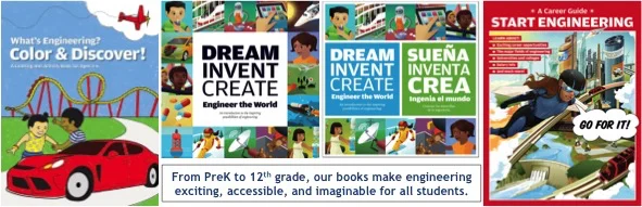Our Dream, Invent, Create Teacher’s Guide makes it easy to get started teaching elementary school engineering, even with no training in the field. And for any outreach or education program, check out What’s Engineering?, Dream, Invent, Create, and Start Engineering: A Career Guide. Our books can help deliver an accessible, engaging picture of engineering to all kinds of K-12 audiences.